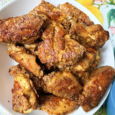 Use 2 pounds (about 1 kg) chicken wings or chicken pieces. In a bowl, mix 1 teaspoon salt, 1 teaspoon black pepper, 1 teaspoon paprika, 1 teaspoon garlic powder, 1 teaspoon onion powder, ½ teaspoon chili powder, ½ teaspoon turmeric, 1 tablespoon soy sauce, 2 tablespoons plain yogurt, and 1 tablespoon lemon juice. Add the chicken and mix well until every piece is coated. Marinate for at least 1 hour or overnight. After marinating, add 2 tablespoons cornstarch and 1...