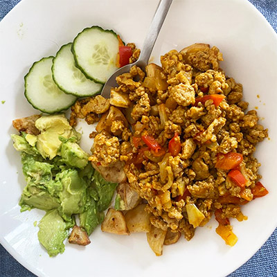 Recipe 1. Pan-fry potatoes in oil until golden; set aside. 2. In same pan, saute onion + garlic 1 2 min. 3. Add ground meat (chicken/turkey/beef) and cook until browned.I ve used turkey. 4. Stir in chopped bell peppers, onion, salt, pepper, and spices (paprika, cumin, turmeric or curry powder). Cook 3 4 min. 5. Add a splash of tomato sauce or chili paste (optional) and mix. 6. Serve with fried potatoes, sliced cucumber, and mashed avocado on the side.