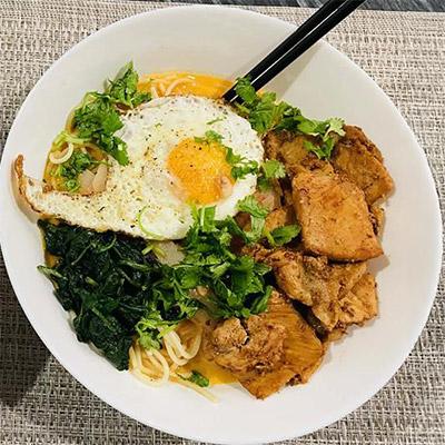 1. Cook noodles Boil noodles, spaghetti or ramen acc to your type drain, and keep aside. 2. Fry chicken Pan-fry sliced meat with salt, pepper, soy sauce, and a little chili. Keep aside. 3. Make broth Saute onion + tomato in oil Add 1 coconut milk + 1 cup water/broth. Add salt, pepper, chili. Simmer 2 3 minutes. 4. Cook spinach Lightly saute spinach with a pinch of salt. 5. Fry eggs Make sunny-side-up eggs. 6. Assemble Put noodles ?...